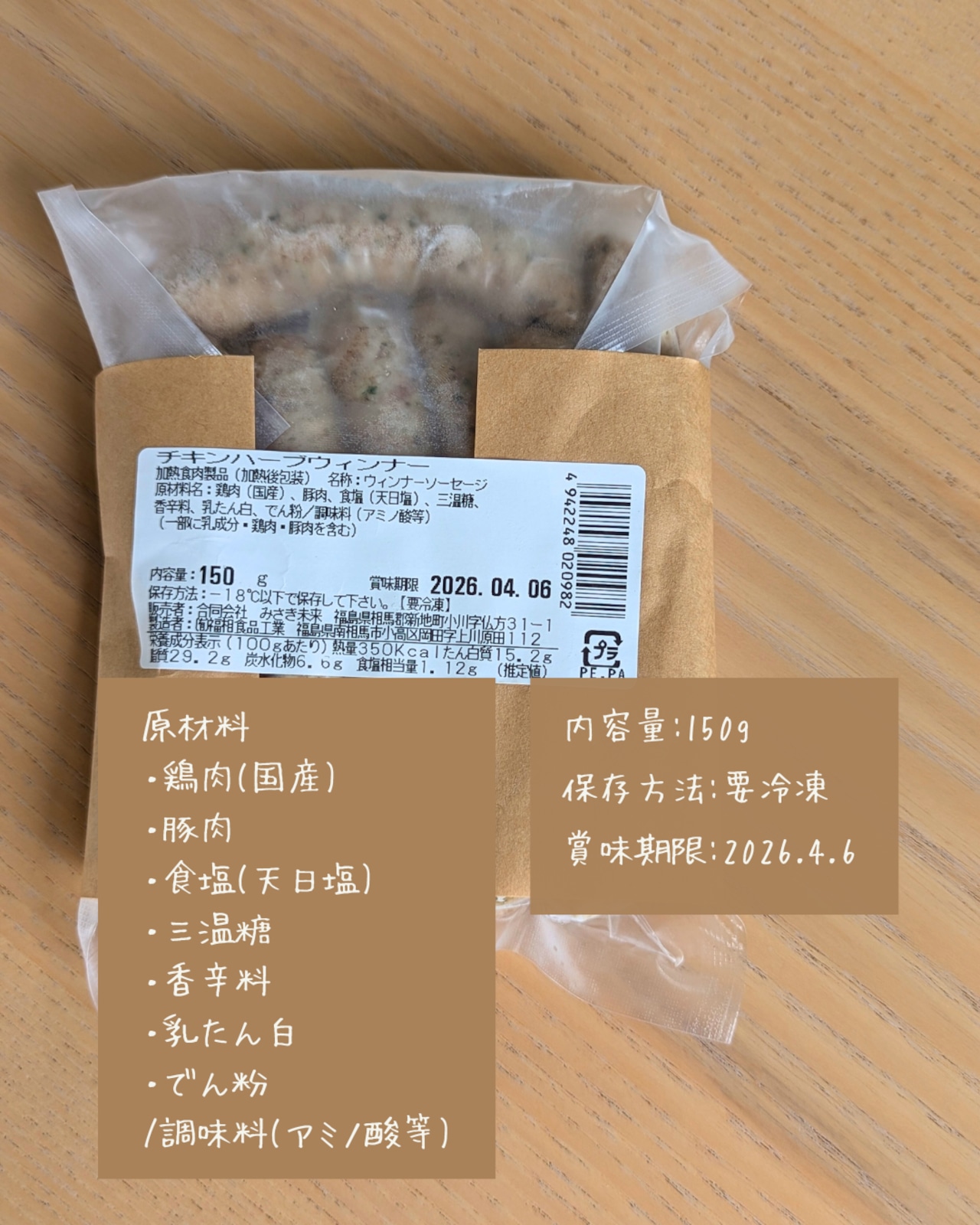 原材料:鶏肉(国産)、豚肉、食塩(天日塩)、三温糖、香辛料、乳たん白、でん粉/調味料(アミノ酸)