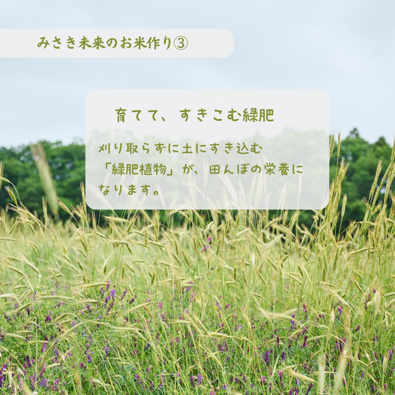 収穫したお米の粒以外の部分は田に戻し、さらに緑肥を栽培し(肥料になる植物を栽培し、収穫せずすき込む方法)土中に有機物を蓄えます。